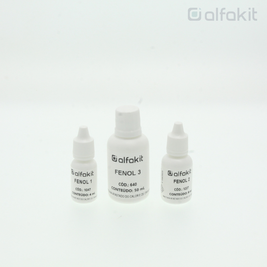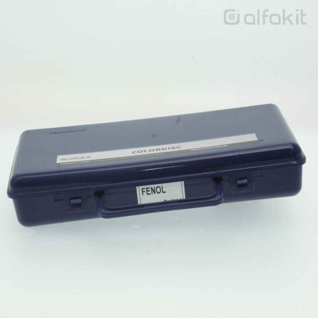 Kit para determinação de Fenol em água e efluente por comparação visual em disco colorimétrico, composto por 3 reagentes com quantidade para 100 testes.