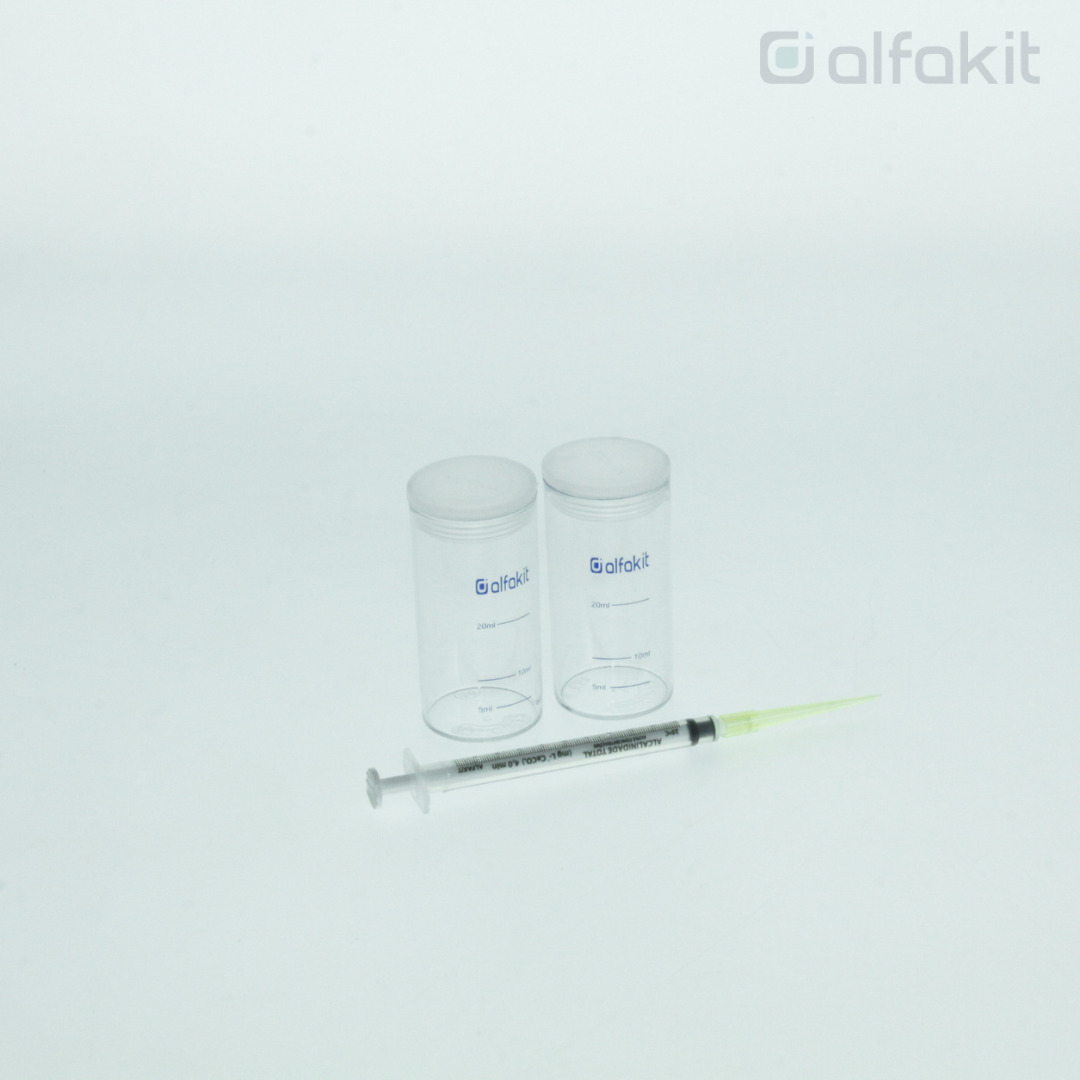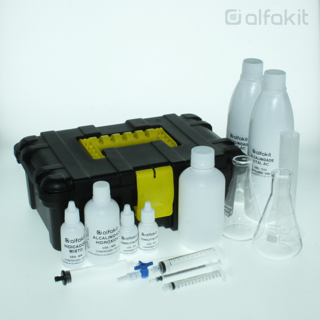Kit para determinação de altas concentrações de alcalinidade na água por titulação, através de seringas pré-calibradas, composto por 2 reagentes com quantidade para 100 testes.