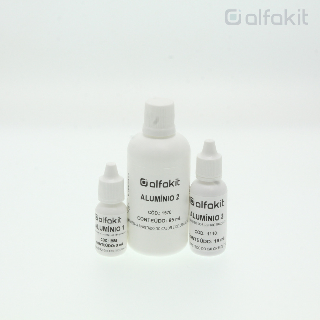 Kit para determinação de alumínio em água e efluente utilizando fotocolorímetro ou espectrofotômetro com quantidade para realizar 100 testes;