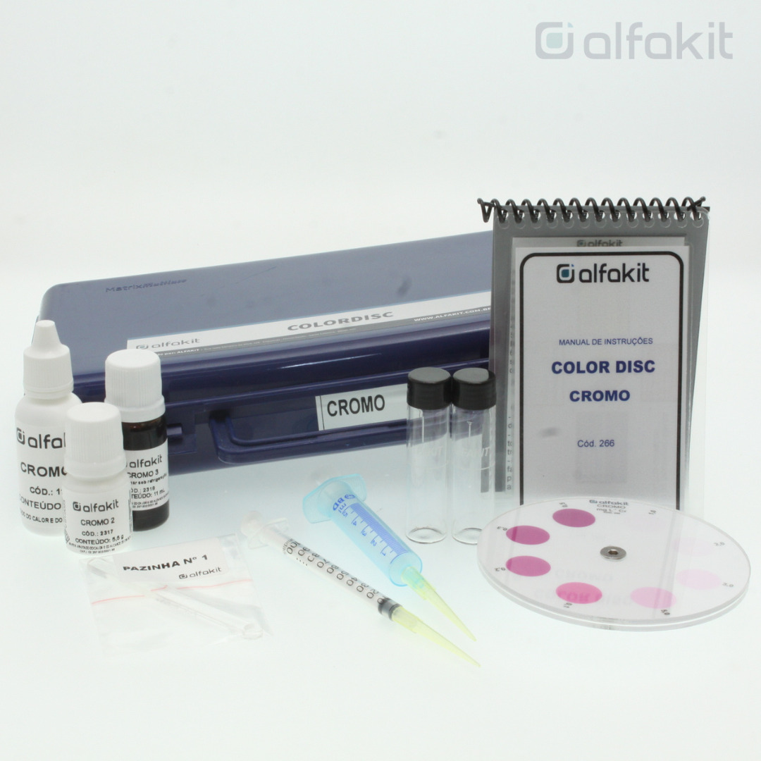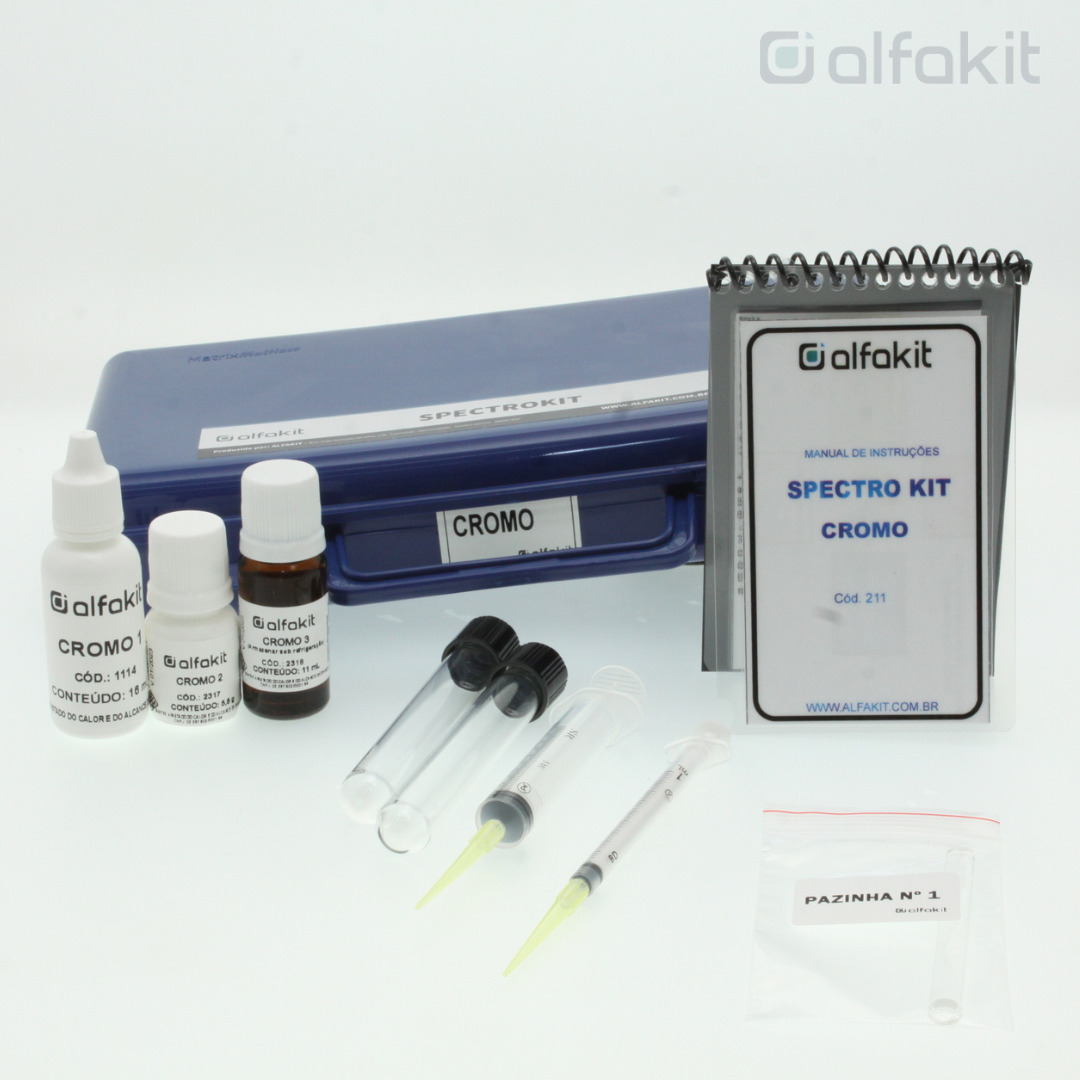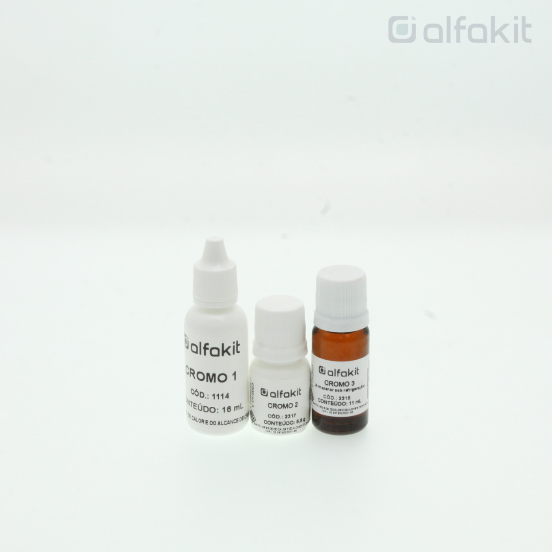 Kit para determinação de cromo em água e efluente para leitura em fotocolorímetro ou espectrofotômetro com quantidade para realizar 100 testes.
